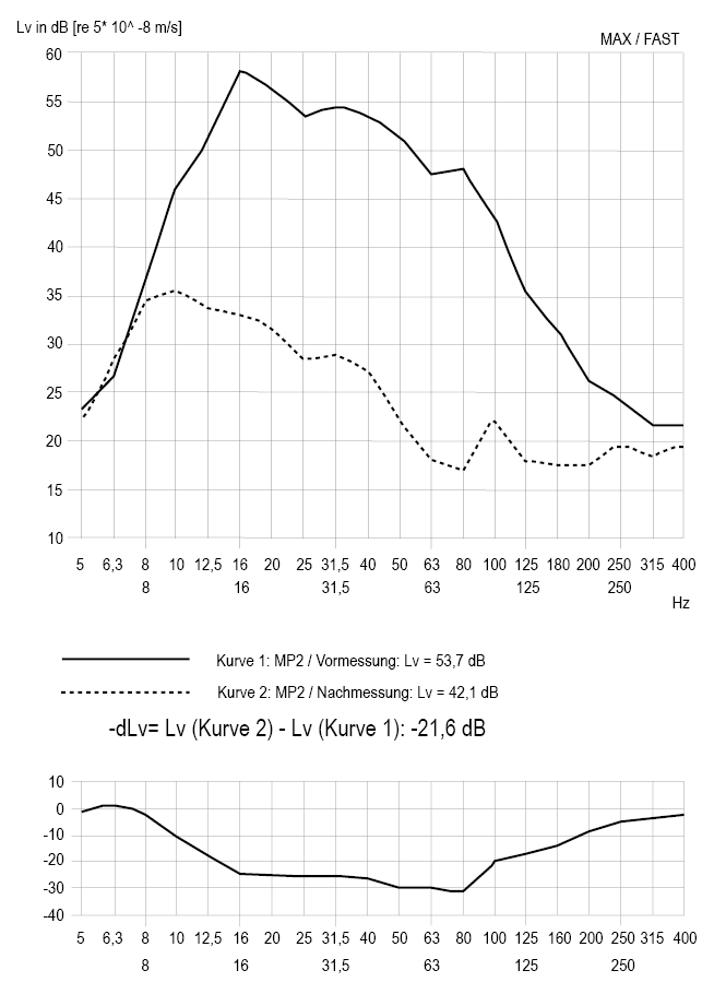 The reduction in peak and rms vibration on the vaudeville floor ranges from 94 % to 98 %. The desired solution was able to reduce the airborne noise level in the music hall by 22 dB and more. The structure-borne noise emitted when trams pass through is at the level of the the background noise and is no longer subjectively perceptible. The renovation carried out is a complete success in terms of both acoustics and vibrations. If a further improvement in the interior level of the music hall is desired, the basic sound level in the room itself has to be further reduced. (Source: Trefzer Rosa + Partner GmbH)